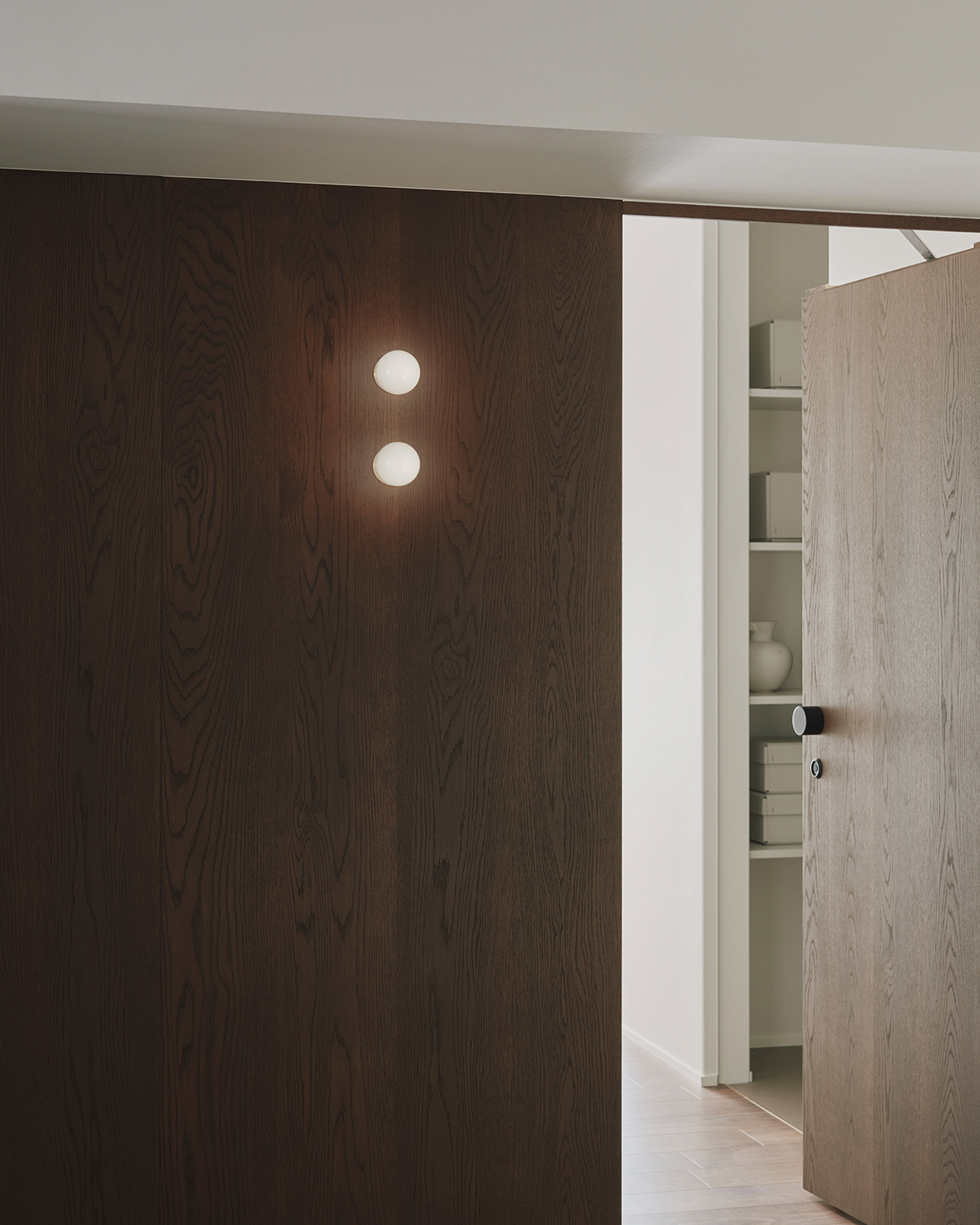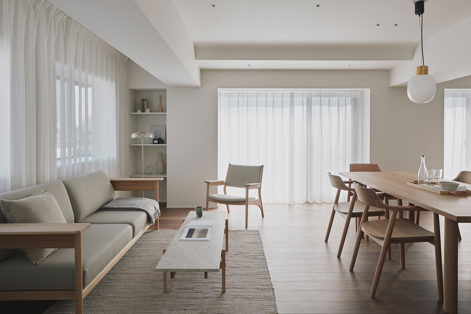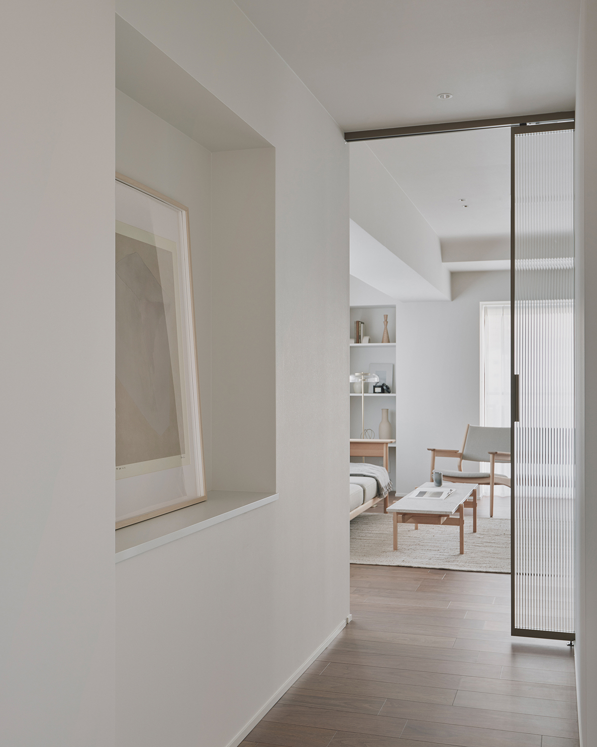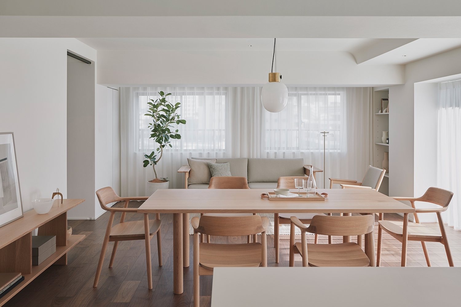 A unit in an apartment building perched on the hills of Akasaka. This corner unit facing southeast boasted excellent sunlight, hinting at its high potential. The view from the windows reveals a neighborhood characterized by dignified architecture and green spaces of varying sizes, exuding an atmosphere of quality and relaxation. To enhance this space, we discussed three key points: rethinking material choices to better reflect the neighborhood’s character; merging the previously separate living, dining, and kitchen areas into one open-plan space; and reconsidering the visibility of the master bedroom door from the entrance. Connecting the street’s ambiance with materials seemed to reduce daily life’s noise. The Corian countertop, selected in Bisque, offered a milky warmth within its white hue, while its transparent surface layer suggested depth and quality. The tea-colored walnut flooring also featured a thin transparent layer, creating an almost velvety texture. Its vintage-like grain pattern harmonized beautifully with the classic architecture. The ceiling of the combined living-dining-kitchen space employs curved surfaces to soften the impression of level changes. These curved details span the main beam, creating continuity and emphasizing the spatial connection. The master bedroom door, positioned near the entrance, was designed to function as a welcoming façade. By using the same material for the door and wall and finishing them flush, paired with dual bracket lights as accents, we achieved a welcoming expression. While each element described may seem like a small detail, their interplay within the space generates visual tranquility and a refined warmth. It envelops this sunlit room like a drowsy air, gently embracing it.
