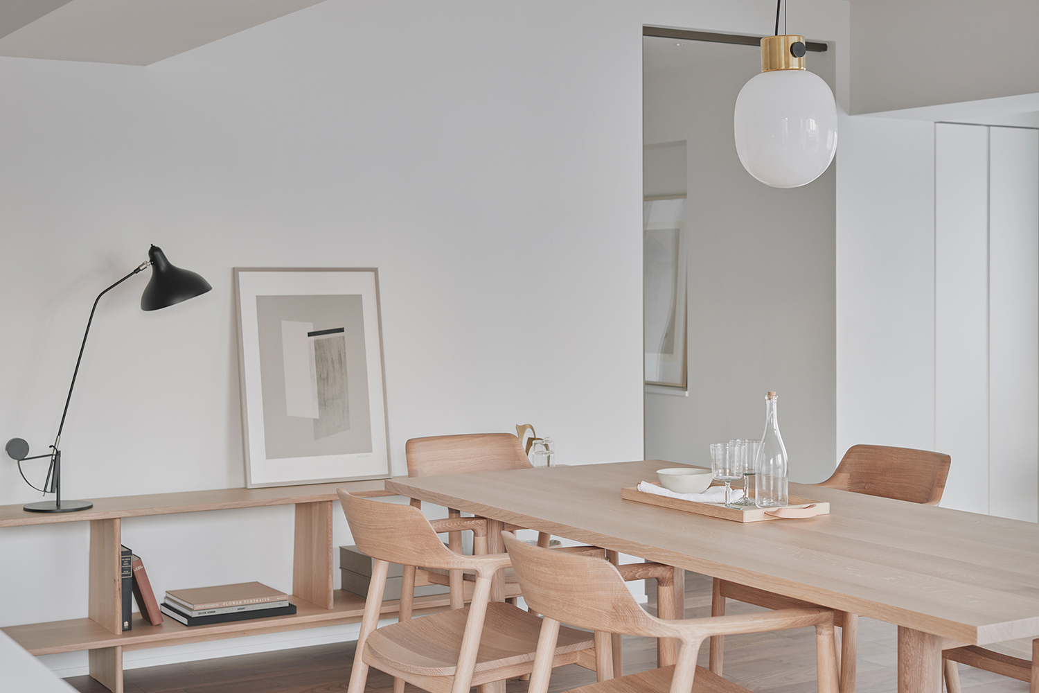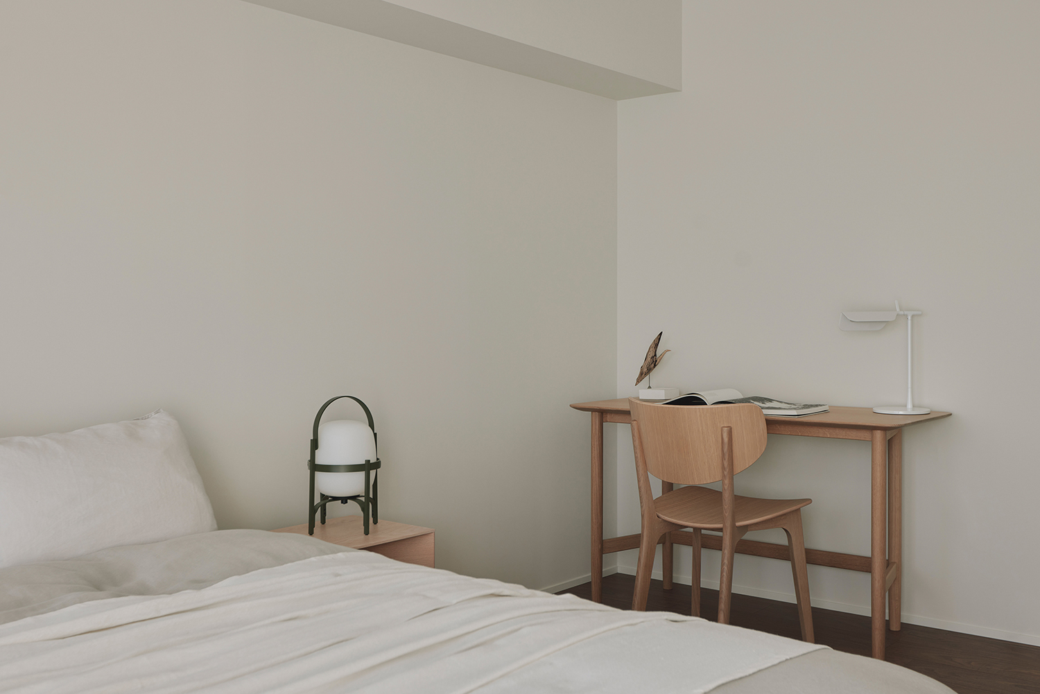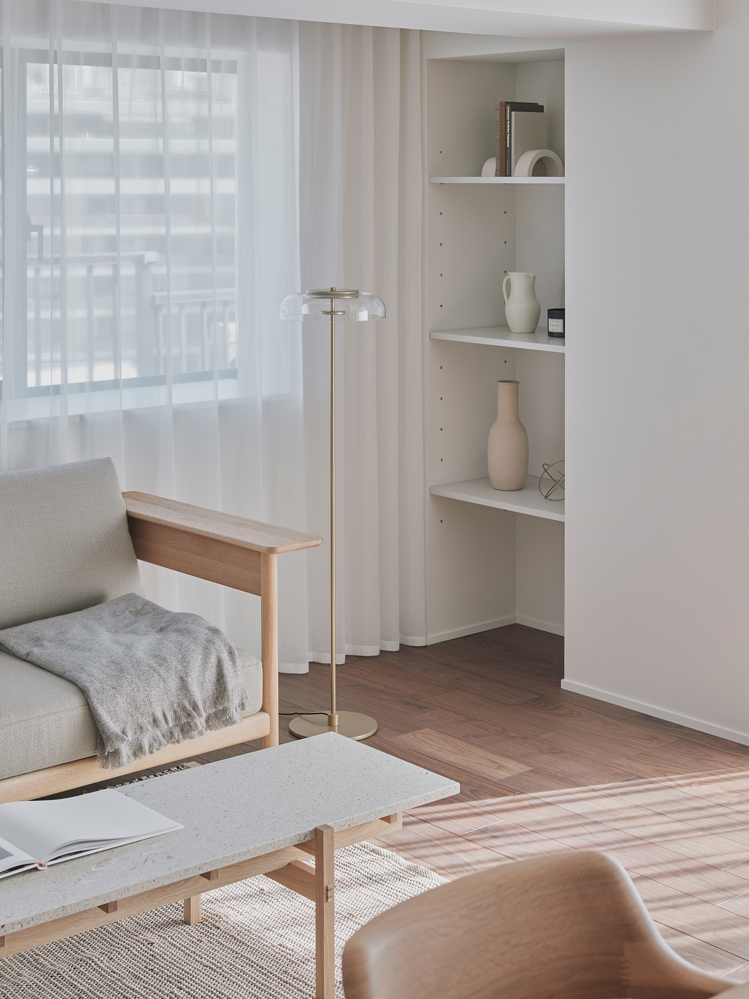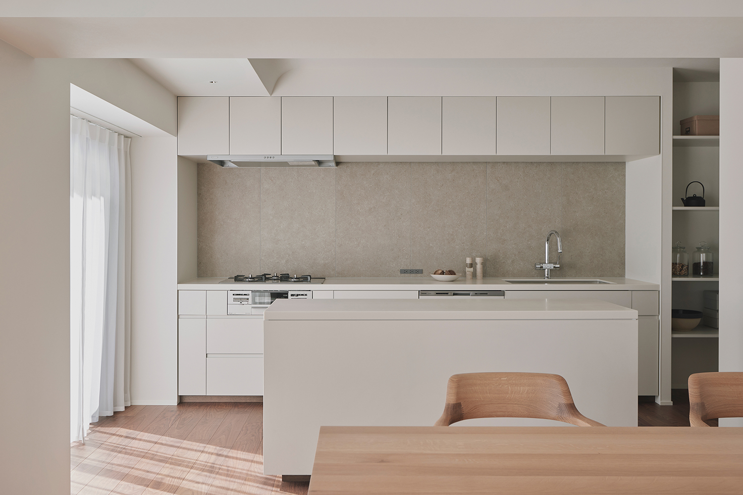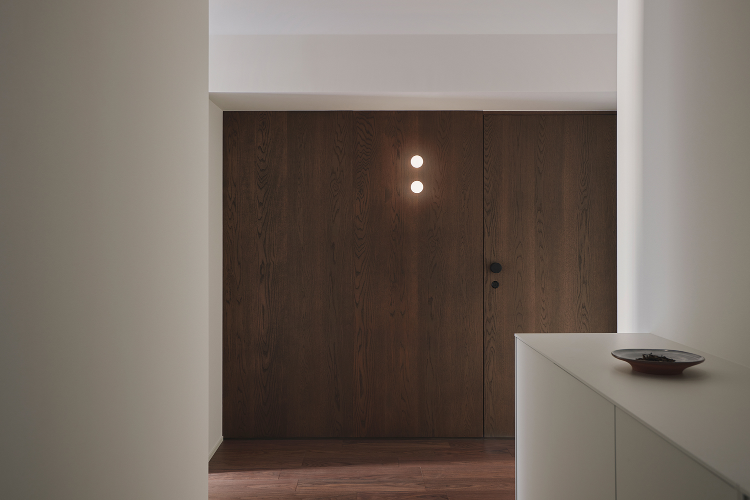 A unit in an apartment building perched on the hills of Akasaka. This corner unit facing southeast boasted excellent sunlight, hinting at its high potential. The view from the windows reveals a neighborhood characterized by dignified architecture and green spaces of varying sizes, exuding an atmosphere of quality and relaxation. To enhance this space, we discussed three key points: rethinking material choices to better reflect the neighborhood’s character; merging the previously separate living, dining, and kitchen areas into one open-plan space; and reconsidering the visibility of the master bedroom door from the entrance. Connecting the street’s ambiance with materials seemed to reduce daily life’s noise. The Corian countertop, selected in Bisque, offered a milky warmth within its white hue, while its transparent surface layer suggested depth and quality. The tea-colored walnut flooring also featured a thin transparent layer, creating an almost velvety texture. Its vintage-like grain pattern harmonized beautifully with the classic architecture. The ceiling of the combined living-dining-kitchen space employs curved surfaces to soften the impression of level changes. These curved details span the main beam, creating continuity and emphasizing the spatial connection. The master bedroom door, positioned near the entrance, was designed to function as a welcoming façade. By using the same material for the door and wall and finishing them flush, paired with dual bracket lights as accents, we achieved a welcoming expression. While each element described may seem like a small detail, their interplay within the space generates visual tranquility and a refined warmth. It envelops this sunlit room like a drowsy air, gently embracing it.