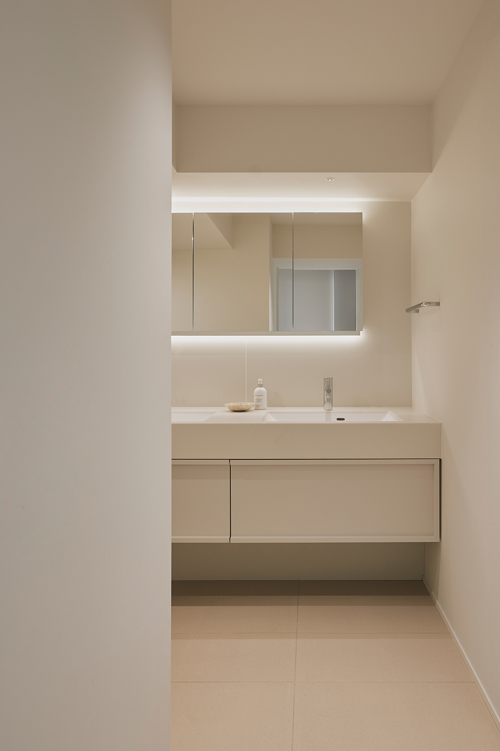赤坂の高台に建つ集合住宅の一室。南東に面した角部屋で日当たりの良さがポテンシャルの高さを物語っていた。窓から見える街並みは風格のある建築と大小さまざまな緑地で上質さとリラックスした雰囲気が漂っている。 私たちはこの部屋をより良くするために3つのことを話し合った。街並みの雰囲気を加味してマテリアルを選び直すこと。それぞれの室に分かれていたLDKをワンルームにまとめて開放的な空間にすること。そしてエントランスから主寝室の扉が見えてしまうことについて再考した。 街並みの雰囲気とマテリアルを繋ぐことは日々の生活からノイズを減らしてくれるように思う。カウンタートップに選定したビスクというコーリアンは白の中でもミルキーなあたたかみがあり表面の透明な層が奥行と上質さを感じさせる。紅茶のような色合いのウォールナットにも表面に薄い透明な層があり吸いつくような質感で、木目のビンテージを思わせる風合いがクラシックな建築とよく馴染んだ。 ワンルームにまとめたLDKの天井には段差の印象を和らげるように曲面を用いた。曲面のディテールは大梁を跨いで連続し空間の繋がりを強調している。主寝室の扉はエントランスに近いことを逆手に取って来客を迎え入れるファサードようにデザインし、扉と壁を同素材かつフラットに納め、2連のブラケットライトをアクセントにウェルカムな表情をつくることができた。 言葉にするとひとつひとつは小さな工夫の断片だが空間の中で関係し合うことで視覚的な静けさと上質なあたたかみを生みだしている。それはまどろんだ空気のようで日当たりのよいこの部屋をやさしく包み込んでいる。